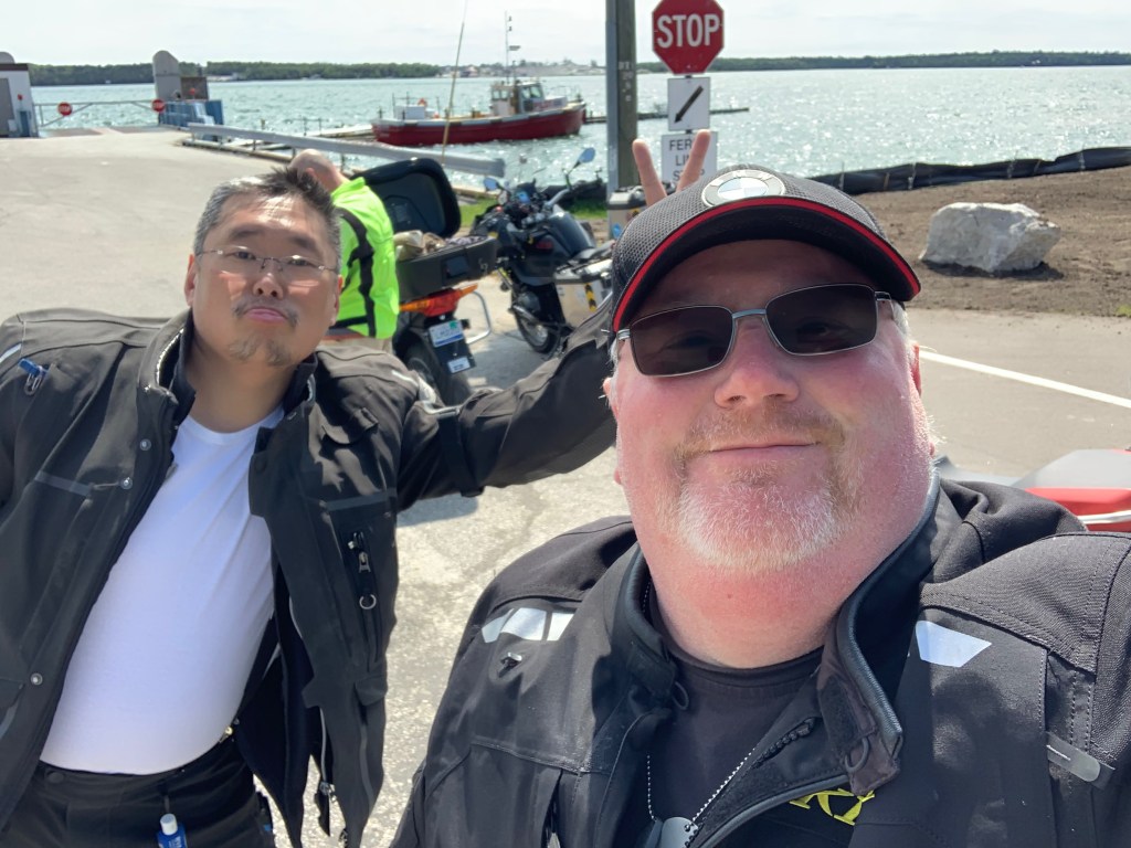 The following day found us at breakfast at the diner next to our hotel. After that we made our way to the ferry for Drummond Island. Drummond Island is just across a narrow passage from De Tour, Michigan, and has quite a bit of curvy paved roads that themselves make in an enjoyable ride. The bit that interested Uly and I more, was the unpaved gravel roads and trails. We found ourselves on one rough two-track trail fairly quickly. Dave rode around on the paved roads and waited for us to come out the other end of the trail. Ulysses went down some pretty demanding trail during a ride in the Badlands, but he’s still not fully comfortable off-road riding. To his credit, he engaged eagerly and we set off down the trail. All went well until the last few hundred yards and Uly’s bike went down. He wasn’t hurt and was able to self-recover and join Dave and I in short order. And of course after that, we had to go to lunch. You’ll note so many of the things we do end in a meal.